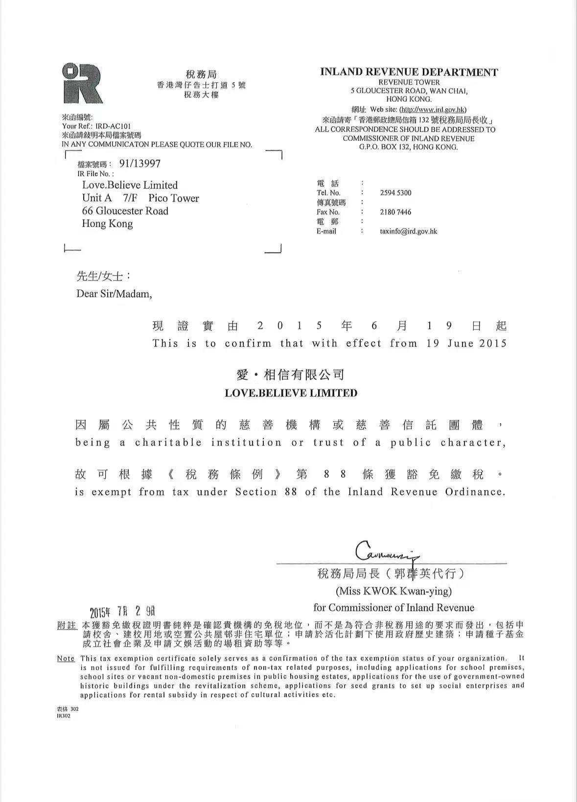 香港愛相信,是自2014年在香港註冊的慈善機構,香港政府特批稅號88,慈善團體可依《稅務條例》第 88 條獲免稅繳稅。